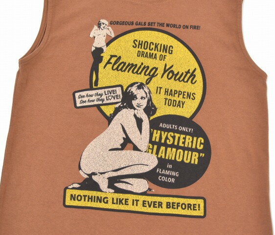 HYSTERIC GLAMOUR WOMENS (ヒステリックグラマー ウイメンズ) FLAMING YOUTH pt ノースリーブ バー二ストソフト天竺素材のオリジナルボディを使用したノースリーブTシャツ「FLAMING YOUTH pt ノースリーブ」。